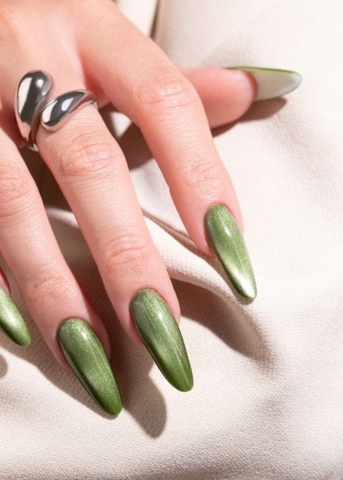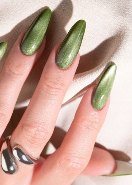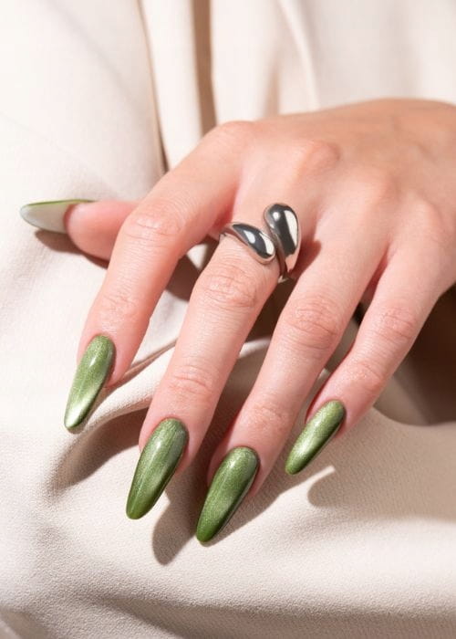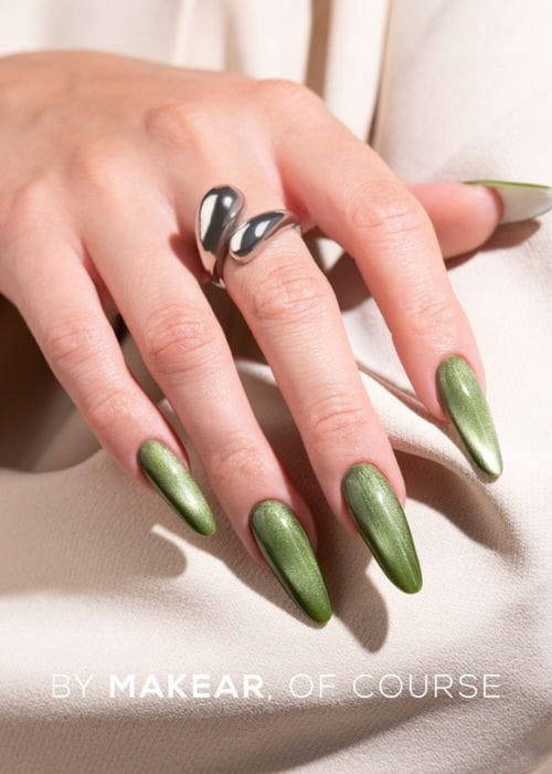 Szlachetny, ciemnozielony odcień inspirowany naturą. Połączony z magnetycznym efektem cat eye staje się wyjątkowo elegancki i nowoczesny. ➡ Must-have dla miłośniczek głębokich, ziemistych barw.